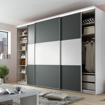 – Une élégante armoire à 2 portes coulissantes (217 cm) offrant de vastes espaces de rangement, une double penderie, et un grand miroir sur la porte droite.