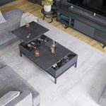 La table basse Colorado d’Akante se distingue par sa polyvalence. Dotée d’une double dinette, elle présente des plateaux en céramique titane exclusive Akante de 3 mm collée sur un support en MDF. Sous ces plateaux, des espaces de rangement pratiques et deux porte-bouteilles facilitent la préparation d’un apéritif. La structure est en MDF laqué d’une peinture grise mate, avec des pieds en acier laqué noir. La tablette de droite se déploie à hauteur de 60 cm vers l’utilisateur, tandis que la tablette latérale s’ouvre à la même hauteur vers la gauche. Les deux tiroirs mesurent 50 x 55 x H16 cm chacun, offrant un espace de rangement généreux.