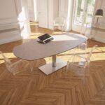 Ontdek de Artica eettafel, een ingenieus stuk dat opvalt door zijn functionaliteit en opmerkelijke esthetiek. Uitgerust met twee automatische verlengstukken die worden geactiveerd door een simpele aanraking van de stang onder het blad, kan de tafel gemakkelijk worden uitgeschoven tot 200 cm om comfortabel plaats te bieden aan je gasten. Het blad van klei keramiek in combinatie met het onderstel van geborsteld geoxideerd staal geeft de Artica tafel een harmonieuze mix van moderniteit en classicisme. Het blad, verlijmd op 8 mm glas, combineert robuustheid en elegantie. De Artica tafel is de perfecte samensmelting van praktisch nut en stijl om je ruimte te verfraaien.