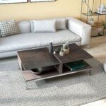 De Arizona salontafel heeft twee praktische planken, ideaal om te genieten van je maaltijden voor de televisie of om je computer te gebruiken vanuit je luie stoel. Deze planken, gemaakt van antraciet staalkeramiek gelijmd op MDF, combineren elegantie met weerstand tegen krassen en warmtevariaties.