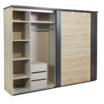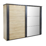 De centrale kledingkast van de Phaedra, met twee schuifdeuren van 217 cm, biedt veel opbergruimte, waaronder een dubbele kledingkast. De rechterdeur van de kledingkast is voorzien van een grote spiegel, wat bijdraagt aan het praktische en elegante karakter van de kamer.